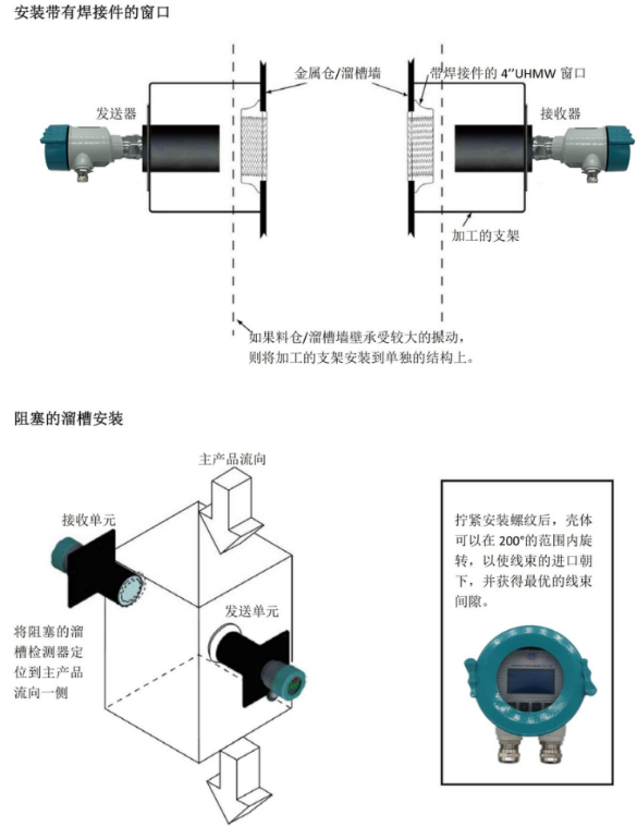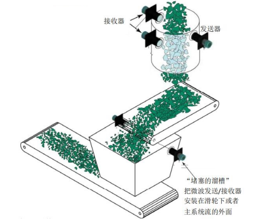 高/低以及溜槽堵塞检测,对于在诸如传输带上的产品运动检测应用中,智能微波对射发射单元/接收单元应安装在转运溜槽或者进料管。