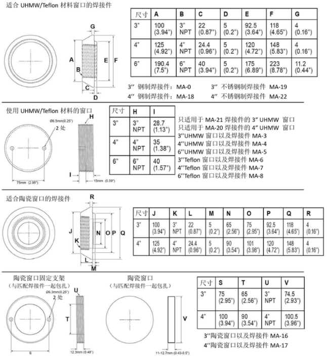 4.在斜筒壁安装微波系统可以使用微波可调节支架(MA-12或 MA-13)。此系统允许将微波安装在倾斜表面,然后调节到水平位置以获得Z优的性能和操作。可调节支架有一个整体式4"焊接件,有UHMW聚乙烯或 PTFE(teflon)窗口可供选择。支架可以选择震动隔离套件(冲击支架),以保护电子元件不受损坏。筒体的每侧壁到垂直线的倾斜角度不能超过30°。安装可调节支架时,只需要切除一个孔,并将 4"焊接件直接焊接到筒体,然后安装窗口,安装微波发送器/接收器,最后调节水平。通过加工安装发送器和接收器的固定支架,可以使这两个的窗口中心线一致,并且通过对两个 MA-4 窗口焊接件对中,可以获得相似的性能。