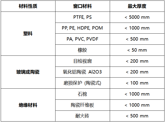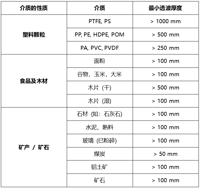 探测不同的介质时,需要一个Z小介质透波厚度。介质的Z小透波厚度与介质材料、颗粒大小、固料密度以及水分含量相关。