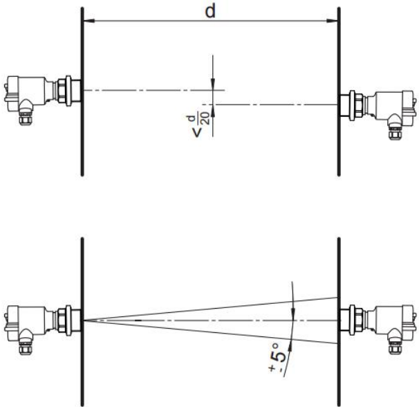 轴错位:允许两个传感器的方向轴相互错位Z多<20%(举例∶当传感器间距为1000mm时,允许这两个传感器相互错位Z多50mm)
